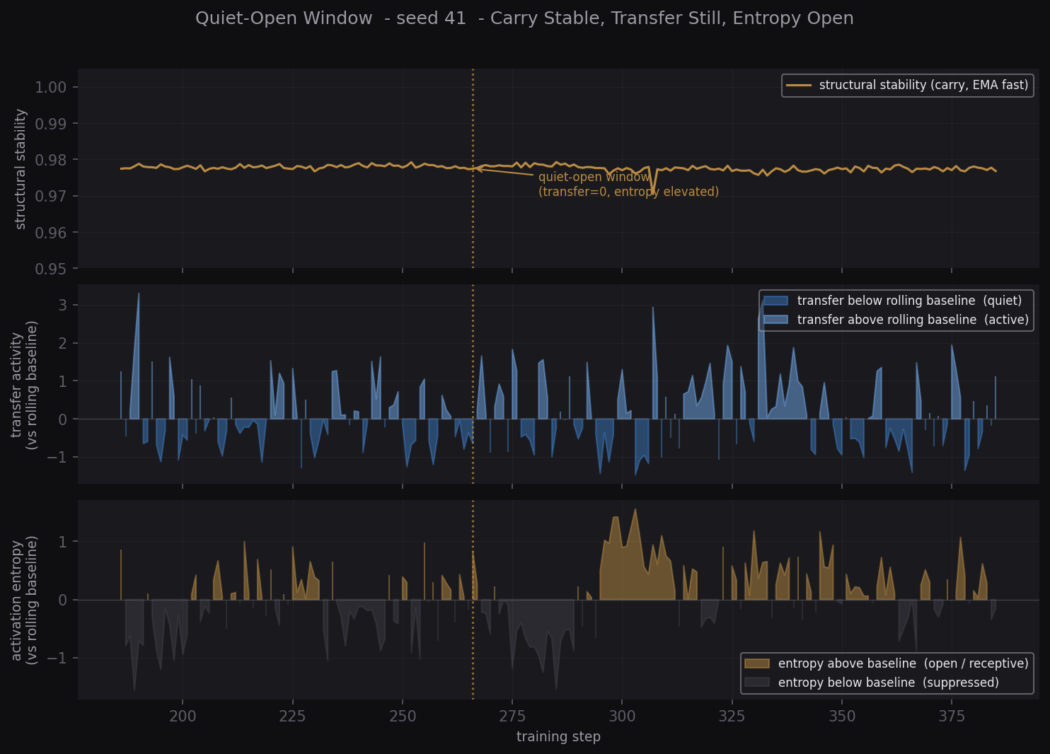 We propose treating training as communication: analyzing what has stabilized before deciding what to update. This preserves coherent structures while enabling continued learning.